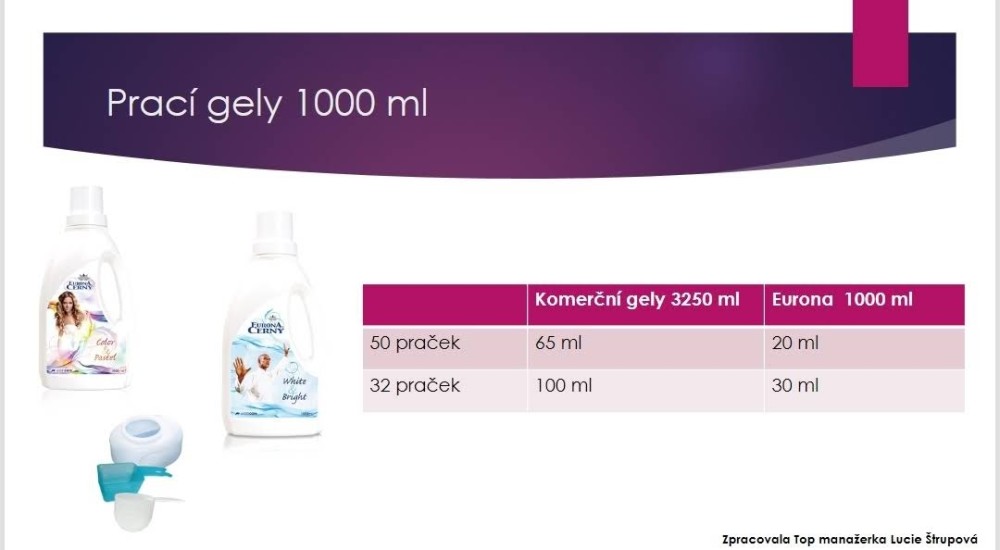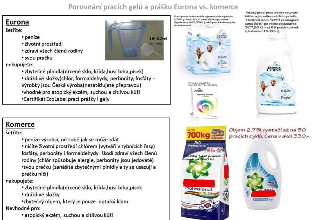 Praní ekologicky šetrnými prostředky má mnoho výhod a mnoho ušetří i v domácím rozpočtu.Pokud své nadšení budete šířit mezi své známé, pak prací prostředky při dosažení 6% což není těžké budete mít od Eurony jako odměnu, tudíž platit za ně nebudete.