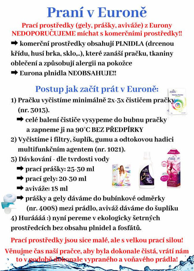K tomu všemu je zapotřebí mít vyčištěnou pračku od plnidel. Vše se u nás dozvíte. Eurona má v nabídce i speciální prací produkty o kterých se také zde dozvíte